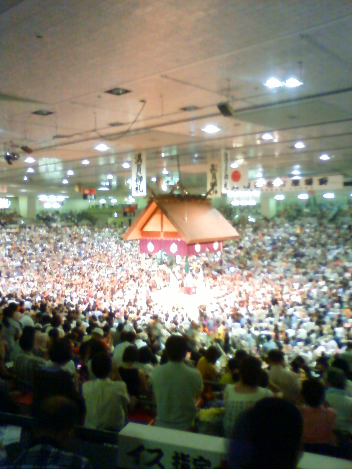 相撲 昨日、大相撲名古屋場所の千秋楽に行ってきました☆ 今まで、あんまり相撲に興味がなくて、行くと決まってからも、『朝青龍がでる日だといいなー!』と、とんちんかんな事を言っていた私です。当日も、お相撲さんの髪の油のいいにおいがかげるのを楽しみにして、行きました。ですが、予想外に、お相撲はおもしろく、中入前の十枚目以下優勝決定戦から大関、横綱までの取り組みは、あっ、という間でした。取り組み前の幕内の土俵入りで、力士が一列に並んで肩を左右にゆさゆさ揺らしながら登場してくる姿は、本当にカッコよかった!まさに、力士、強者たち、という感じでした。琴欧洲大きい(◎-◎)そして、横綱の土俵入りは、いうまでもなく、オーラばんばんでした。千秋楽までに、優勝者が決まってなかったという事で、最後まで勝負の行方がどうなるかわくわくしながら観戦しました。また来年も名古屋場所きたいなあ。チケットをとるのが、大変だけど、また千秋楽にぜひいきたいです! [1回]